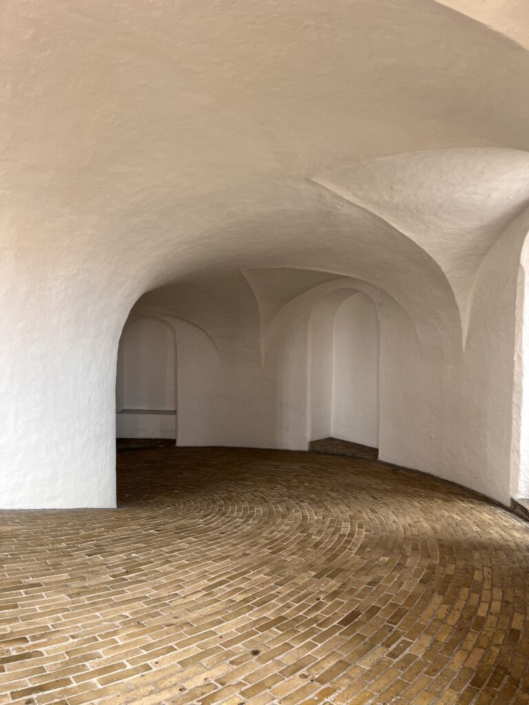 Fotografija zavojitog, bijelog prostora s opekom prikazuje unutrašnjost Rundetårna – jednog od najneobičnijih tornjeva u Europi. Umjesto stepenica, toranj ima blagu spiralnu rampu kojom se penješ sve do vrha. Prostor je arhitektonski vrlo snažan, gotovo meditativan, a pogled s vrha pruža prekrasan pregled krovova Copenhagena. Uspon je lagan i ugodan, bez napora – još jedan primjer kako je i povijesna arhitektura ovdje prilagođena čovjeku.