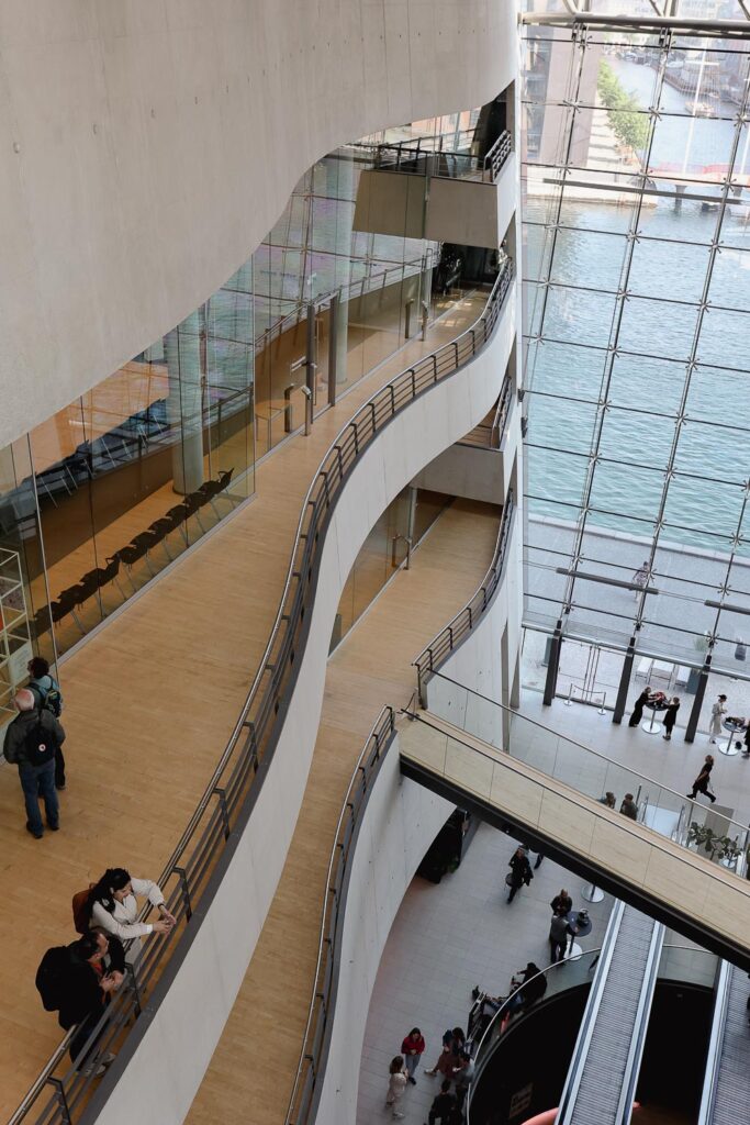 Čak i ako ne planiraš ulaziti unutra, šetnja uz Black Diamond je obavezna. Pogledi na kanal, mostove i grad su fantastični, a prostor djeluje kao produžetak javnog boravka uz vodu.